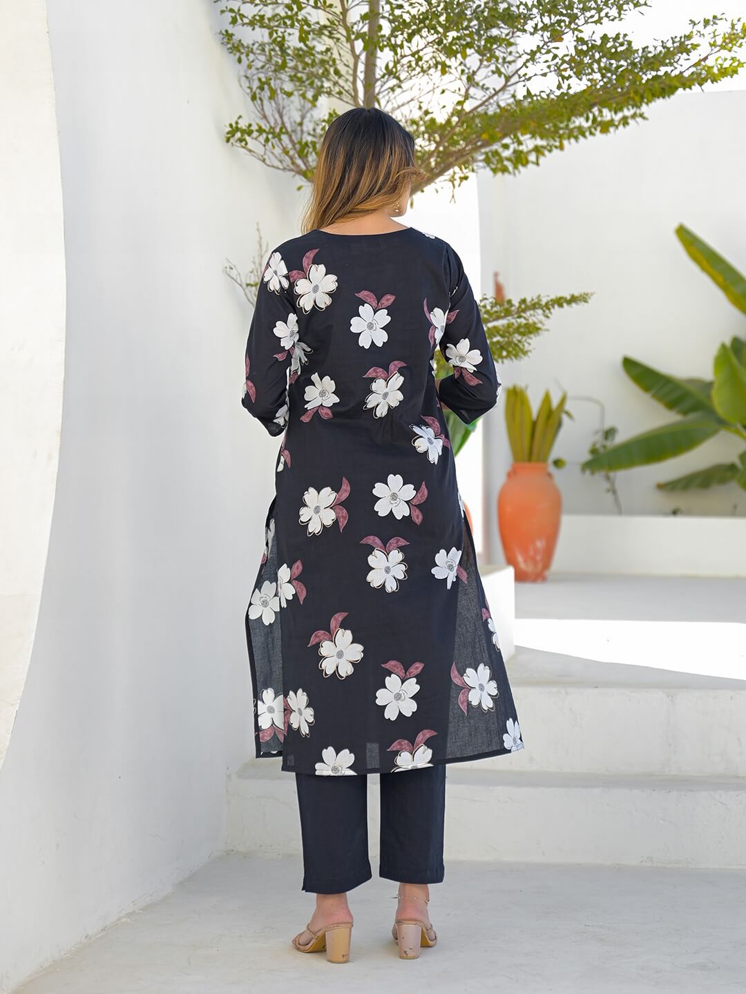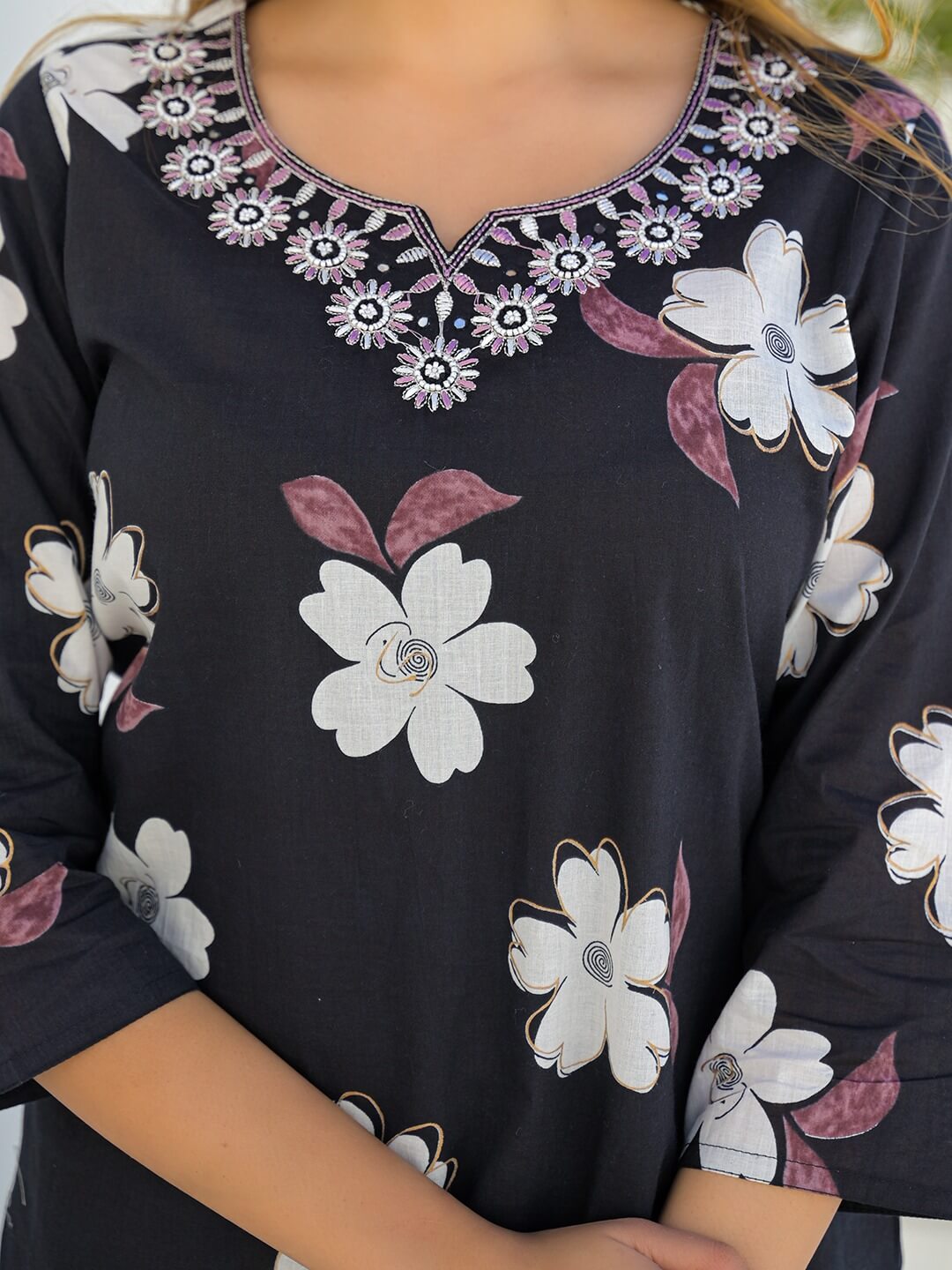 Black Round Neck Floral Straight Kurta Pant Set With Dupatta